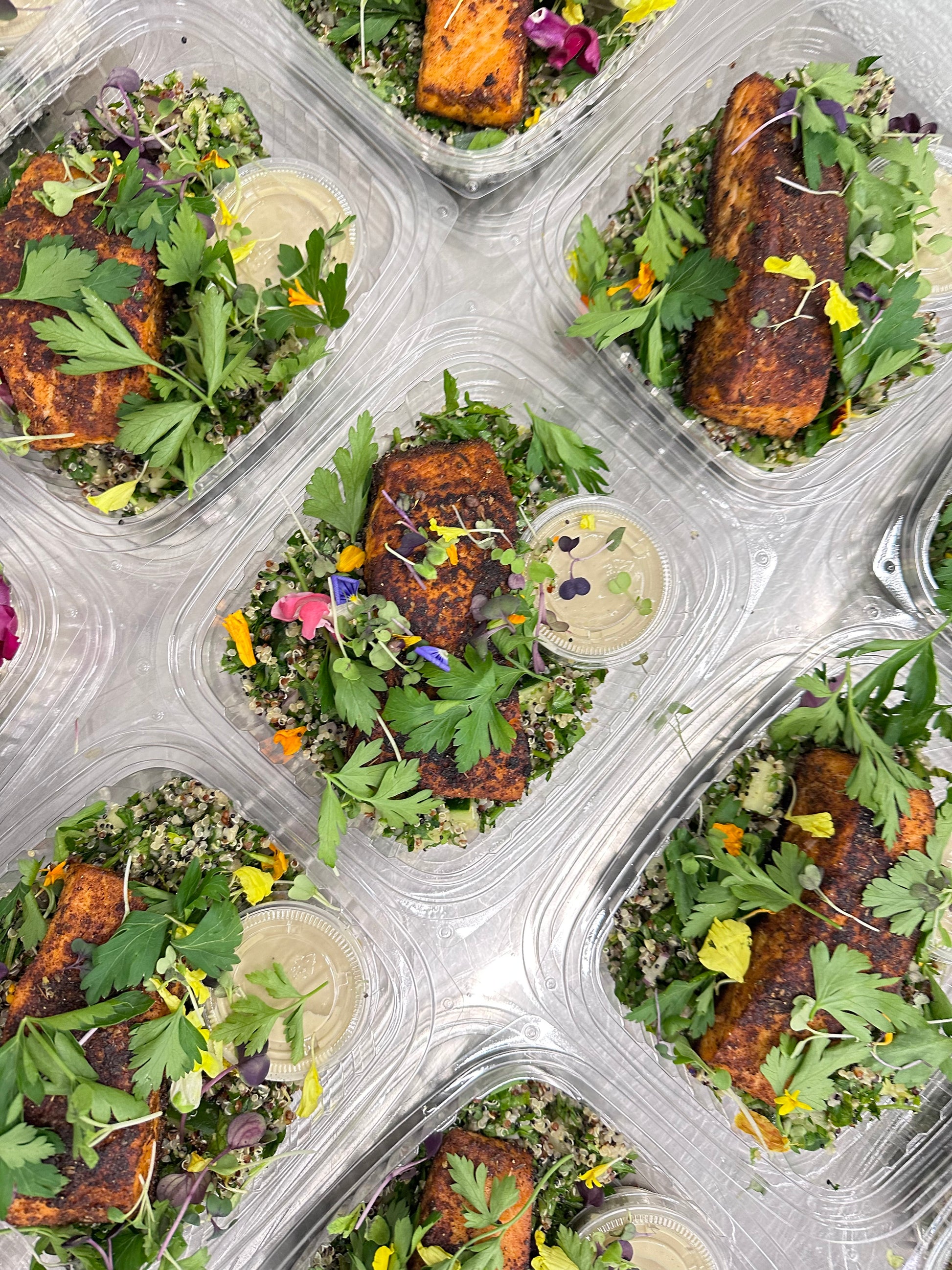 Ingredients: sustainable salmon, smoked paprika, onion granules, garlic granules, dried thyme, dried oregano, cayenne, organic tricolor quinoa, black lentils, parsley, red onion, cucumber, lemon zest and juice, Sicilian extra virgin olive oil, Sicilian sea salt, black pepper, Seed + Mill tahini, garlic, arugula