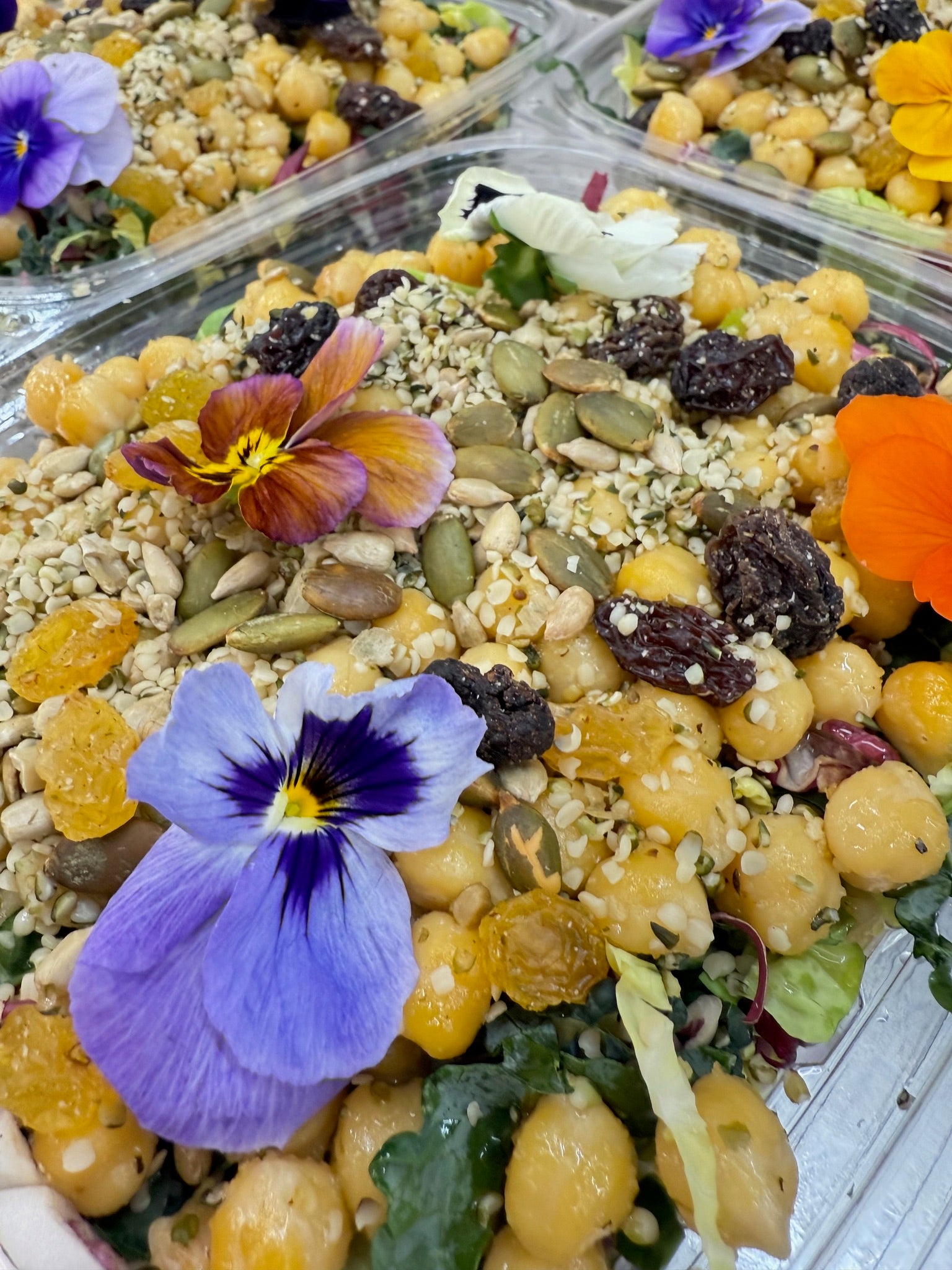 Ingredients: chickpeas, 4some (Sicilian sea salt, black pepper, garlic granules, onion, granules), Sicilian extra virgin olive oil, lacinato kale, brussels sprouts, radicchio, sunflower seeds, pepitas, hemp seeds, black raisins, golden raisins, vegan Caesar dressing (cashews, lemon zest and juice, garlic, capers, nutritional yeast, Sicilian extra virgin olive oil, black pepper, Sicilian sea salt), edible flowers