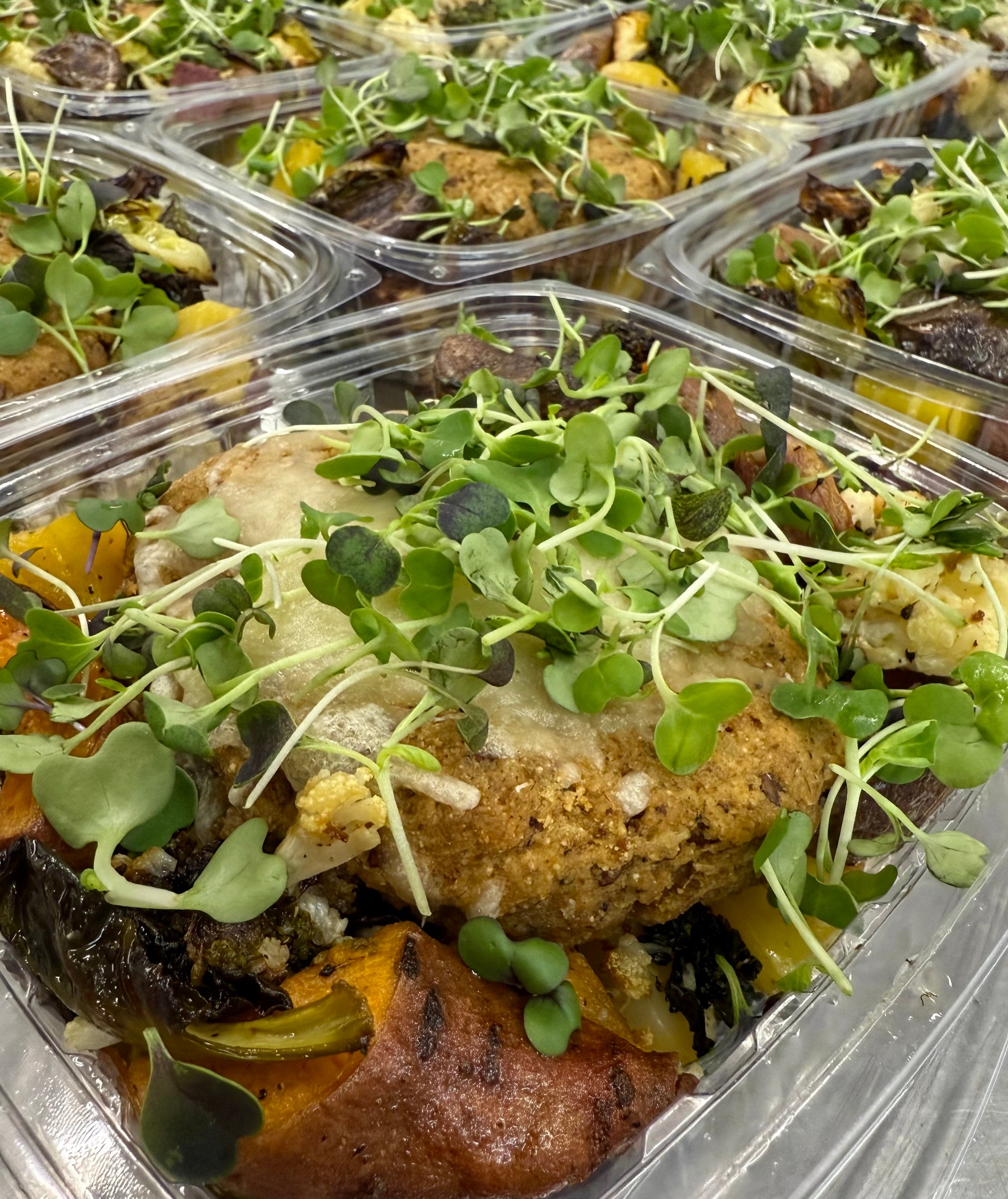 Ingredients: green lentils, chickpeas, kidney beans, sweet potato, trumpet mushrooms, kale, quinoa carrots, yellow onion, garlic, parsley, GF oats, tiger nut flour, Kneadlove breadcrumbs, ground flax, dijon mustard, tomato paste, thyme, swiss, 4some, Sicilian extra virgin olive oil, rainbow vegetables, garlic aioli (garlic, cashew, lemon juice, Sicilian extra virgin olive oil, Sicilian sea salt, black pepper, water), micro greens